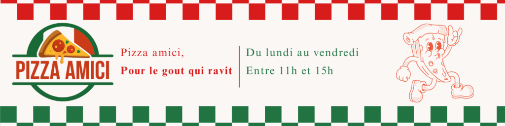 Chaque jour, nous préparons nos pizzas devant vous. En effet, nous utilisons des produits de qualité pour que chaque bouchée soit un vrai plaisir. Nos recettes s’inspirent des saveurs traditionnelles italiennes, tout en restant simples et efficaces. Que vous soyez pressé entre deux cours ou que vous souhaitiez profiter d’un moment convivial avec vos amis, Pizza Amici est alors l’endroit idéal.